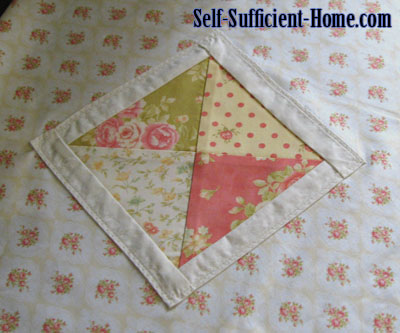 For the back, the 4 triangles were placed in the corners of the main square. I ironed down 1/4″ edge on each triangle then used a decorative stitch on top of the fabric to secure them onto the main square.