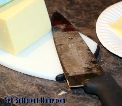 I sliced this 2lb brick into roughly 1/8″ slices. I used our large chef’s knife for this task.